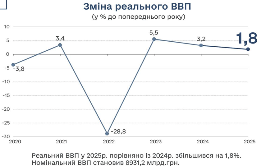 В 2025 году реальный валовый внутренний продукт (ВВП) Украины вырос на 2,2%. Об этом в январе 2026 года говорится в сообщении Министерства экономики, окружающей среды и сельского хозяйства. Отмечается, что экономика Украины показала рост близкий к прогнозируемому. Среди факторов, поддерживающих экономическую активность в 2025 году: реализация программ восстановления и развития бизнеса; рост потребления домохозяйств в условиях продолжающегося повышения зарплат; значительные капитальные расходы бюджета на восстановление критической инфраструктуры, жилищные программы и закупку отечественной продукции сектора ОПК.[1]