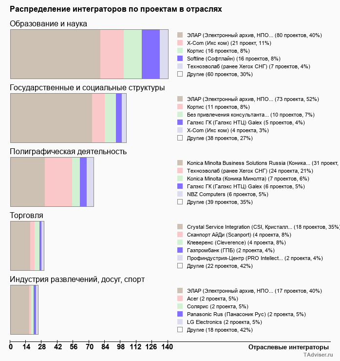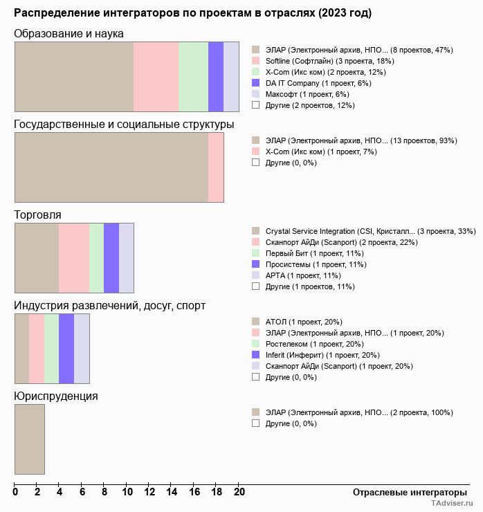 Отраслевое распределение по количеству проектов внедрений