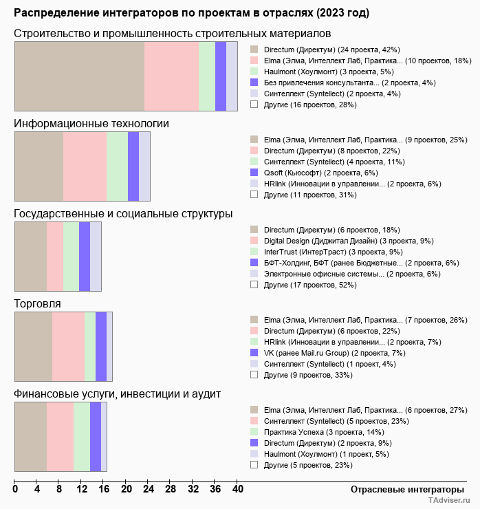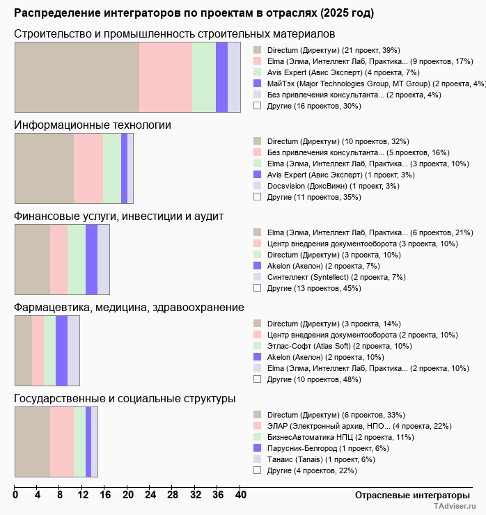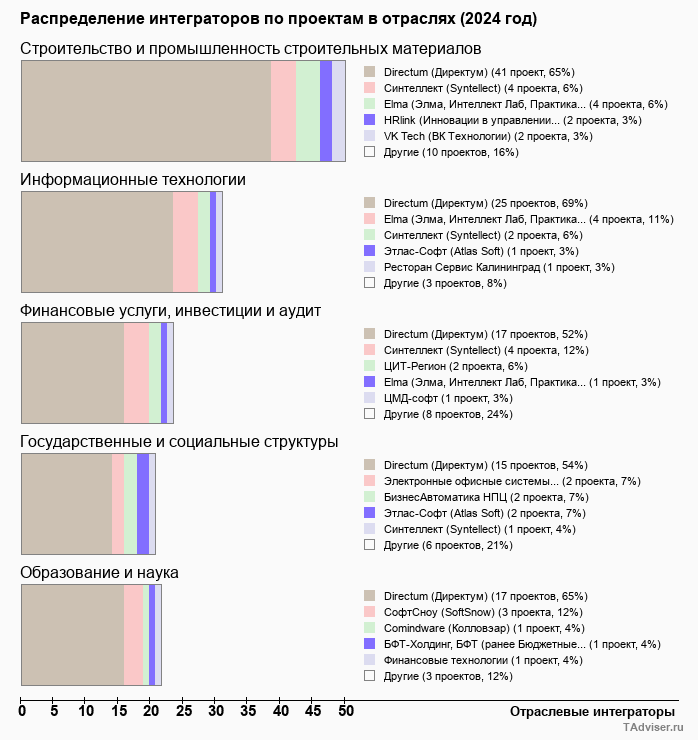 За весь период наблюдений база TAdviser аккумулировала информацию о 8,4 тыс. проектов внедрения СЭД/ECM/CSP-систем (по состоянию на декабрь 2024 года). Из них более 1,3 тыс. проектов было выполнено за последние 3 года. В топ-5 отраслей - лидеров внедрений СЭД в 2022-2024 годах входят отрасли строительства, ИТ, финансов, а также государственный сектор и сфера образования.
